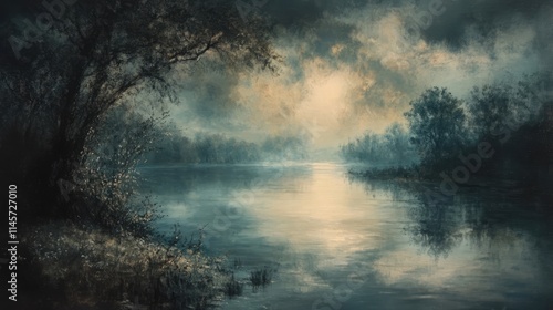Serene riverside landscape with dramatic skies and tranquil water reflecting light in a picturesque natural setting.