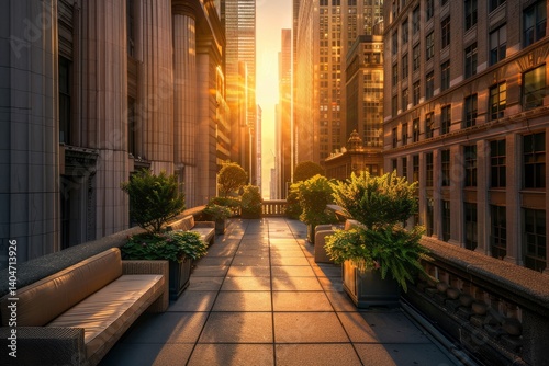 Serene rooftop terrace at sunset with city skyline, lush greenery, and warm golden light