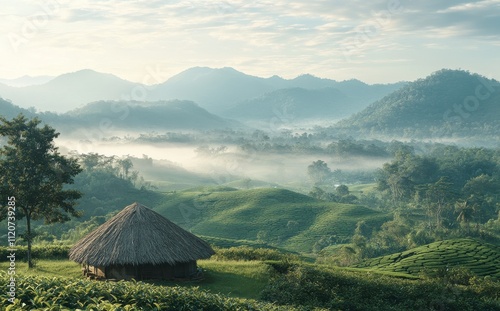 Serene Rural Landscape with Hut Amidst Lush Green Hills and Misty Mountains in Early Morning Light