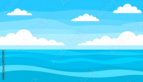 Serene seascape with a calm ocean and fluffy white clouds under a bright blue sky