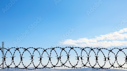 Serene Sky Above Barbed Wire Fence in Open Landscape, Capturing Contrasting Elements of Nature and Security in a Tranquil Setting Under Bright Blue Weather