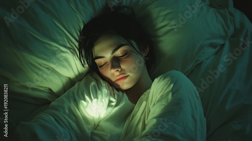 Serene slumber - A woman peacefully sleeps in soft green light.