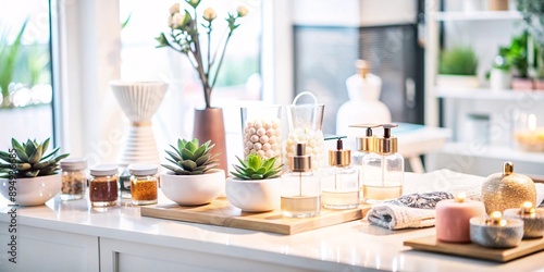 Serene Spa Setting. A bright and airy image featuring a collection of white spa accessories, towels, candles, and delicate flowers, creating a tranquil and luxurious atmosphere.