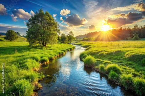 Serene Stream, Grassy Meadow, Nature Photography, Calm Water, Lush Green, Summer Landscape, Peaceful Scene, River in Field, Wildlife Habitat, Flowing Water, Natural Beauty, Pastoral Setting