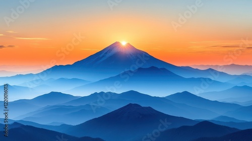 Serene Sunrise in Cartoon Mountains: Minimalist Landscape of Majestic Range in Morning Light, Calm and Peaceful Scene