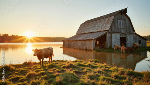 Serene sunrise over flooded barn with farm animals, spring beauty