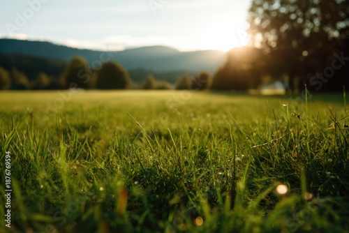 Serene sunrise over lush green meadow with dew-kissed grass and distant trees