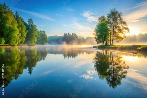Serene Sunrise Over Still Waters, Reflecting Lush Greenery and Misty Morning Calm