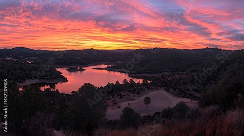 Serene Sunrise over the Lake and Hills: A Breathtaking Panorama