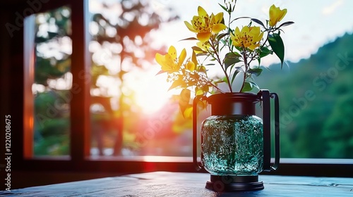 Serene Sunset Yellow Flowers in Glass Vase on Wooden Table