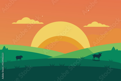 Serene Sunset Landscape Pastoral Scene with Silhouette Animals