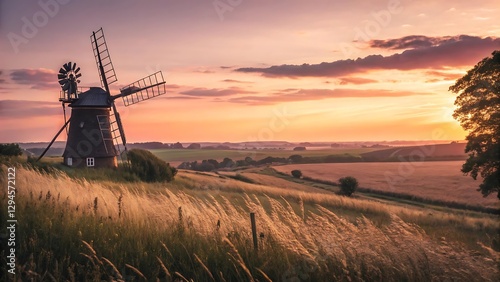 Serene Sunset Landscape with Windmill Picturesque Rural Scene