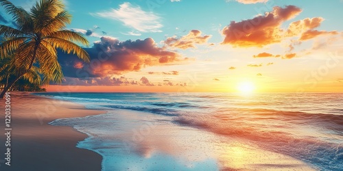 Serene Sunset: Ocean Waves Crashing on Sandy Beach, Palm Trees Swaying Gently in Paradise, Tropical Vacation Dreams