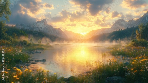Serene sunset over a misty lake surrounded by mountains and flowers.