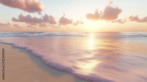 Serene sunset over calm ocean waves on sandy beach. (1)