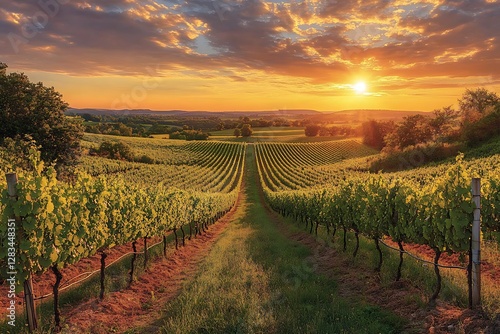 Serene sunset over lush vineyard rows, with vibrant skies and distant hills creating a tranquil scene