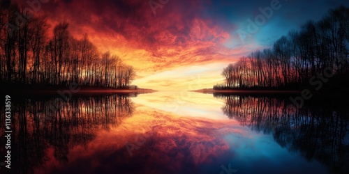 Serene Sunset Reflection Over Calm Waters and Silhouetted Trees