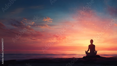 Serene Sunset Yoga: Silhouette Meditating on the Beach Rocks