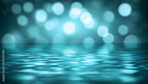 Serene teal water reflecting soft bokeh lights; tranquil, calming background ideal for product displays or websites.