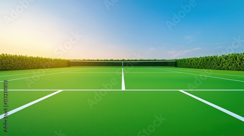 Serene Tennis Court Under Clear Sky with Green Surroundings and Bright Sunlight