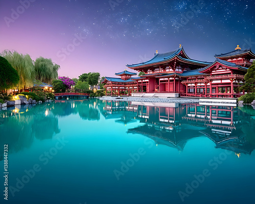 Serene twilight view of a traditional East Asian temple reflected in a tranquil pond under a starry sky