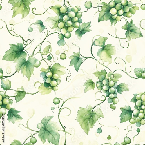 Serene watercolor doodle pattern of grapevines with delicate tendrils on a soft cream background