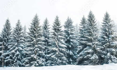 Serene Winter Forest with Snow-Covered Pine Trees Against a White Sky Background, Capturing the Tranquility and Beauty of a Frosty Winter Morning