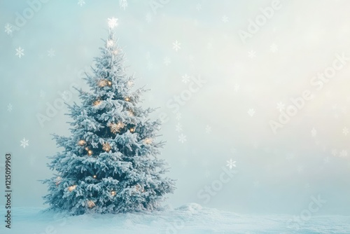 Serene Winter Landscape with Snow-Covered Christmas Tree and Falling Snowflakes in a Tranquil Holiday Setting
