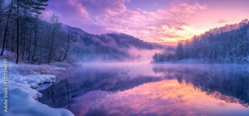Serene winter sunrise reflected in still lake
