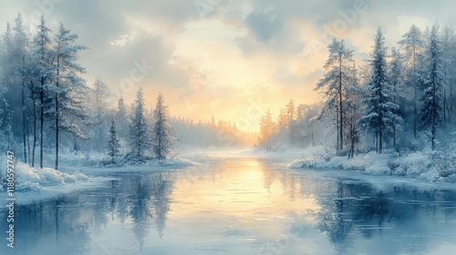 Serene winter sunset, frozen river, snow-covered pines.