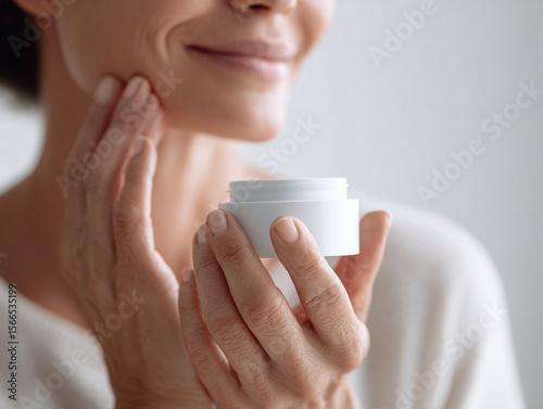 Serene woman applying cream to her face. Clean beauty, skincare, wellness concept. Perfect for beauty blogs, health articles, and cosmetic promotions.