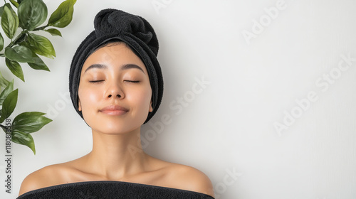 Serene Woman in Salon Setting Relaxing with a Towel on Her Head Surrounded by Greenery, Creating a Calm and Tranquil Atmosphere for Self-Care and Beauty