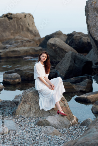 Serene woman in white dress sitting on rock by water with rocky landscape in background