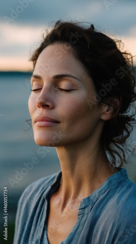 Serene woman with eyes closed in nature light Peaceful and mindful portrait with calm facial expression Tranquil scene by water
