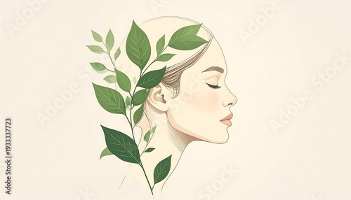 Serene woman with leaves cascading down her face and hair, embodying nature's beauty and tranquility in an elegant illustration.