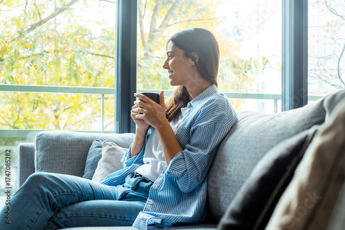 Serene young woman sitting alone at home, smiling softly while looking around and daydreaming about love, career and life, enjoying a peaceful moment of calm and happiness in her cozy living room