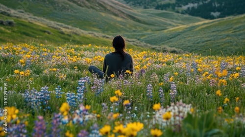 Serenity in nature: woman meditating in a field of colorful wildflowers