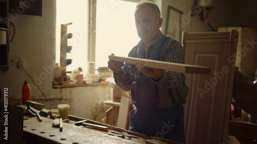 Serious man preparing wooden plank for product indoors. Man blowing out sawdust
