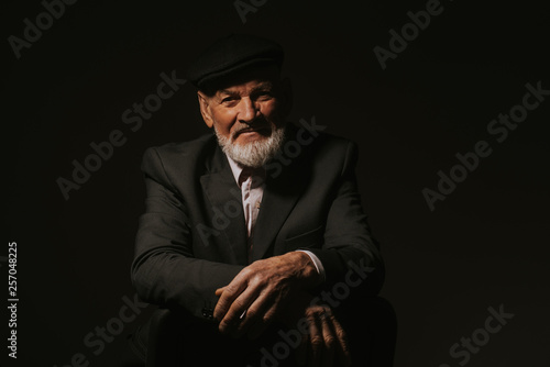 Serious middle-aged man with folded arms and a deadpan expression posing in front of a dark background