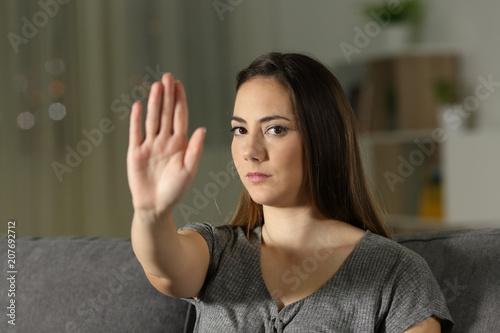 Serious woman gesturing stop at home