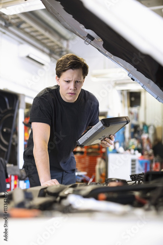 Serious young male car mechanic with digital tablet analyzing car engine