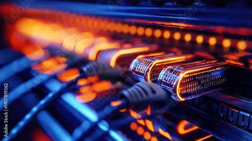 Server rack connections glowing in orange and blue light