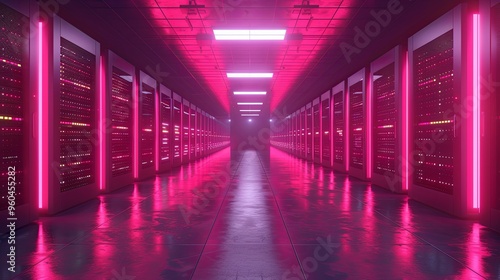 Server room data center. Backup, mining, hosting, mainframe, farm and computer rack with storage information. 3d render