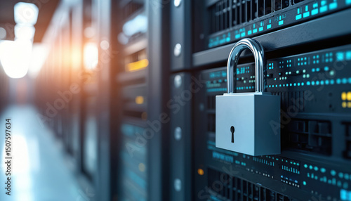 Server room data security with locked padlock. Concept digital data protection. Secure modern data center. Cyber security in network. Server racks, information technology concept.