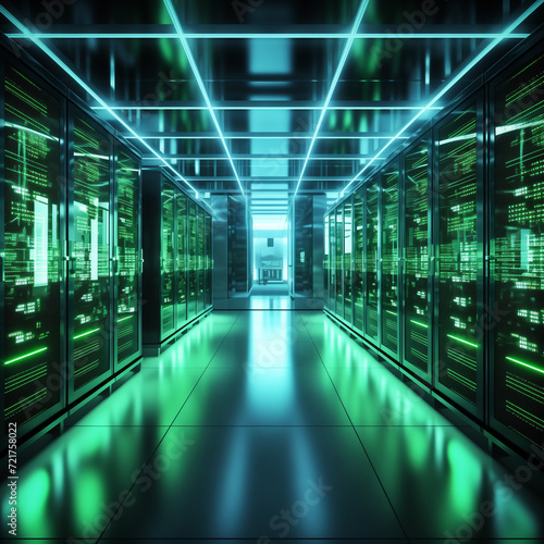 Server room in datacenter with data servers. Green LED lights flashing.