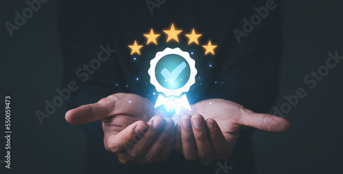 Service Quality assurance. Hand shows the sign of the top service Quality assurance 5 star, Guarantee, Standards, ISO certification and standardization concept.