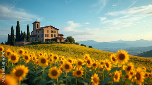 Set amidst a radiant sunflower field, this tranquil hilltop home offers stunning panoramic views of sprawling mountains and open skies."