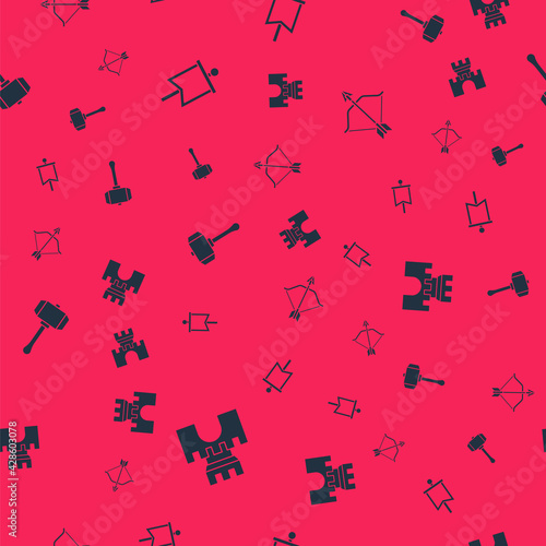 Set Castle, fortress, Medieval flag, Hammer and bow and arrow on seamless pattern. Vector