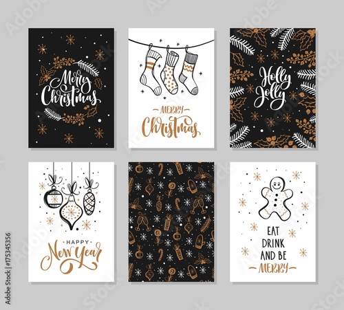 Set Christmas and Happy New Year greeting cards with handwritten calligraphy and decorative elements.