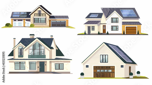 set Classic and modern family house residential apartment buildings. Real estate home property. Set Contemporary standard suburban urban village style with gable and flat roof solar panels.